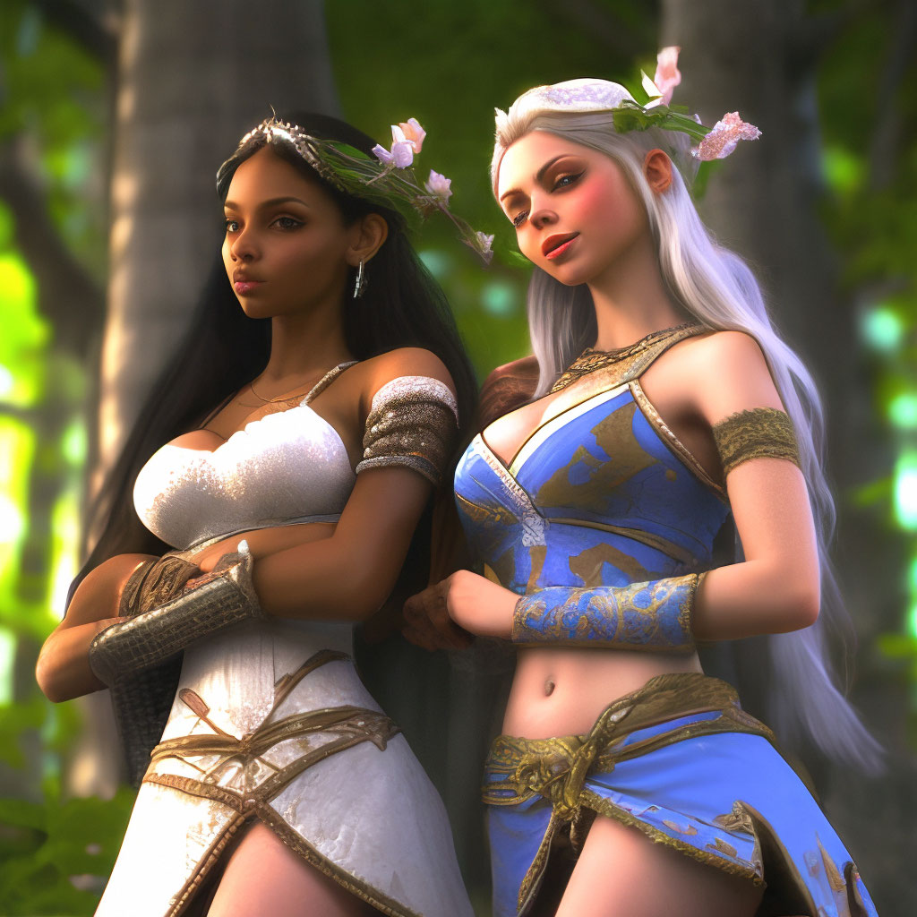 "Two elf girls walk in the garden and have a nice conversation , blue hair, blon